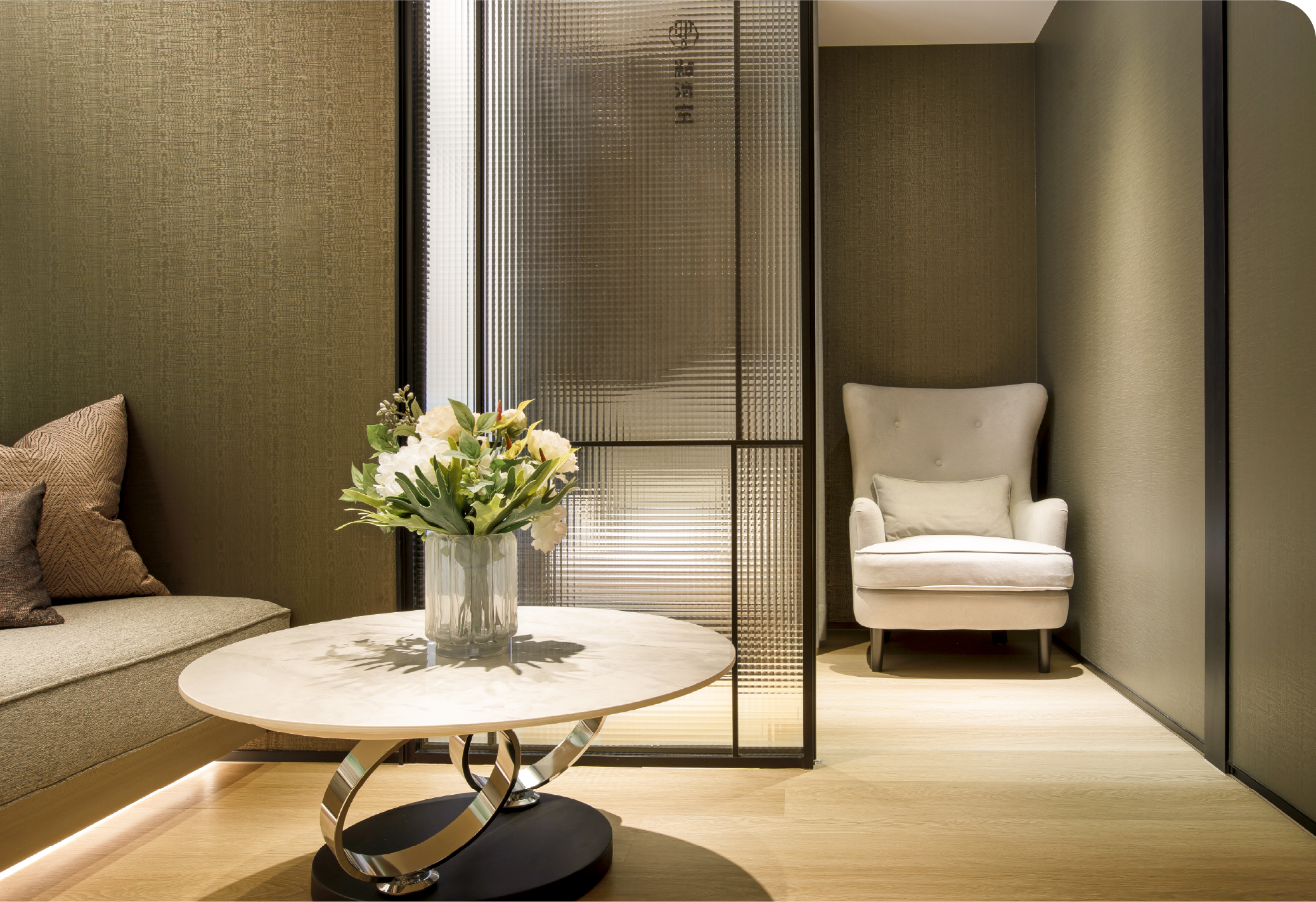 Lounge點滴室舒適柔軟具有支撐度的沙發,柔和的光線,搭配質感大理石與鋼材的精巧邊桌,讓您的點滴療程更具舒壓效果 -